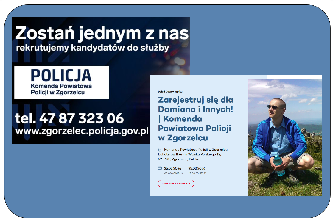 Myślisz o służbie w Policji? To dobry moment, żeby zrobić pierwszy krok! Komenda Powiatowa Policji w Zgorzelcu zaprasza na Dni Otwarte dla kandydatów do służby. To świetna okazja, żeby poznać wymagania stawiane kandydatom oraz uzyskać informacje na temat poszczególnych etapów rekrutacji. Tego dnia możesz zrobić coś więcej niż tylko zaplanować swoją przyszłość. Na miejscu będzie możliwość rejestracji jako potencjalny dawca szpiku! To szybki i bezbolesny proces, który może uratować komuś życie. Nie zwlekaj, przyjdź, zapytaj i być może już wkrótce założysz policyjny mundur.