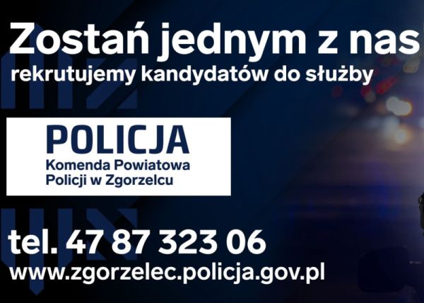 Marzysz o pracy, w której każdy dzień przynosi nowe wyzwania i daje satysfakcję z pomagania innym? Chcesz realnie wpływać na bezpieczeństwo swojego miasta i jego mieszkańców? Wstąp w szeregi zgorzeleckich policjantów. Chcesz dowiedzieć się więcej na temat rekrutacji, przyjdź do Komendy Powiatowej Policji w Zgorzelcu przy ul. Boh. II Armii Wojska Polskiego 12G lub zadzwoń pod numer 47 87 322 14.