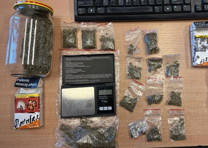 W trakcie interwencji 38-letni mieszkaniec powiatu zgorzeleckiego zachowywał się agresywnie i używał słów wulgarnych. Podczas sprawdzenia prewencyjnego policjanci ujawnili przy nim woreczki foliowe z suszem roślinnym. W związku z podejrzeniem posiadania środków odurzających, funkcjonariusze przeprowadzili przeszukanie miejsca zamieszkania 38-latka. Tam znaleźli kolejne porcje suszu, zarówno w woreczkach foliowych, jak i w słoiku oraz wagę elektroniczną.